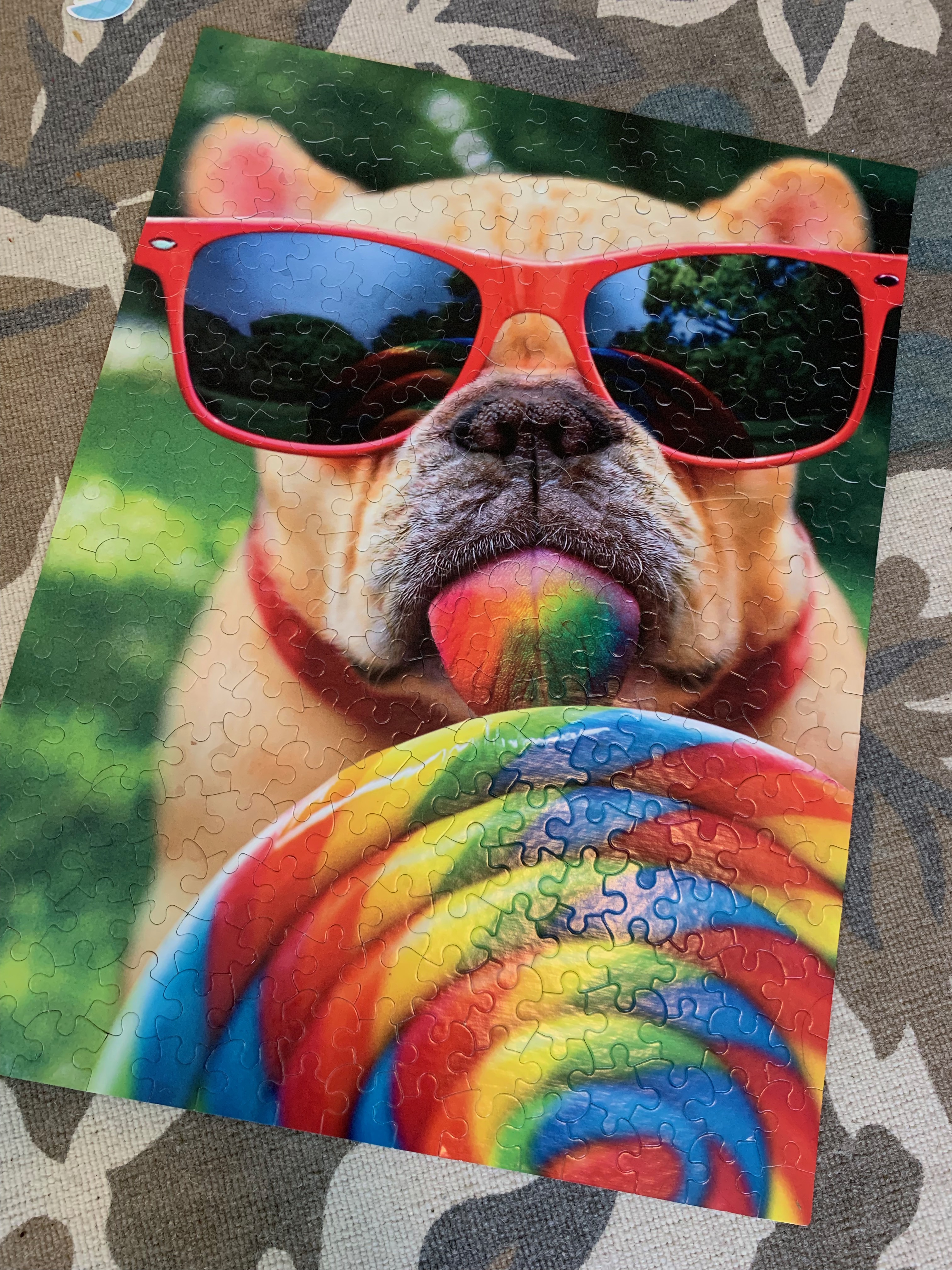 As we worked through the puzzle – a magnificent rendering of a french bulldog with oversized sunglasses licking an equally giant lollipop – Rowan was getting super frustrated with it. He’d picked, as usual, the hardest part of the puzzle to work first – skipping the conventional route of always putting the edges together first in favor of going straight to the colorful swirl lollipop where any piece could fit any other. I held my tongue (we’ve had the ‘edges first’ conversation a number of times) and let him try to work through it, rather than give advice he didn’t need or want to hear. As time went on, though, the frustration became sniffles and sniffles became real tears.