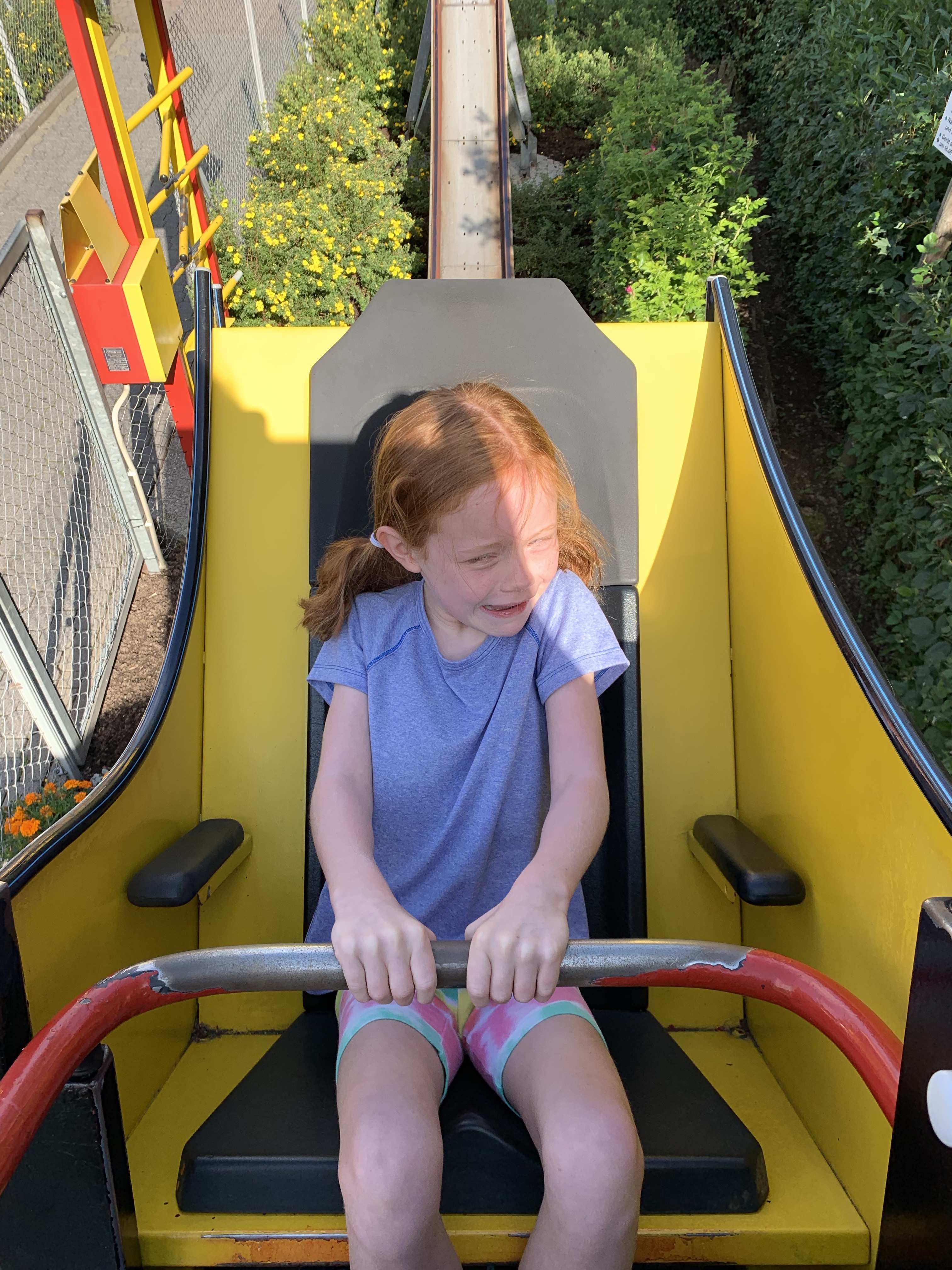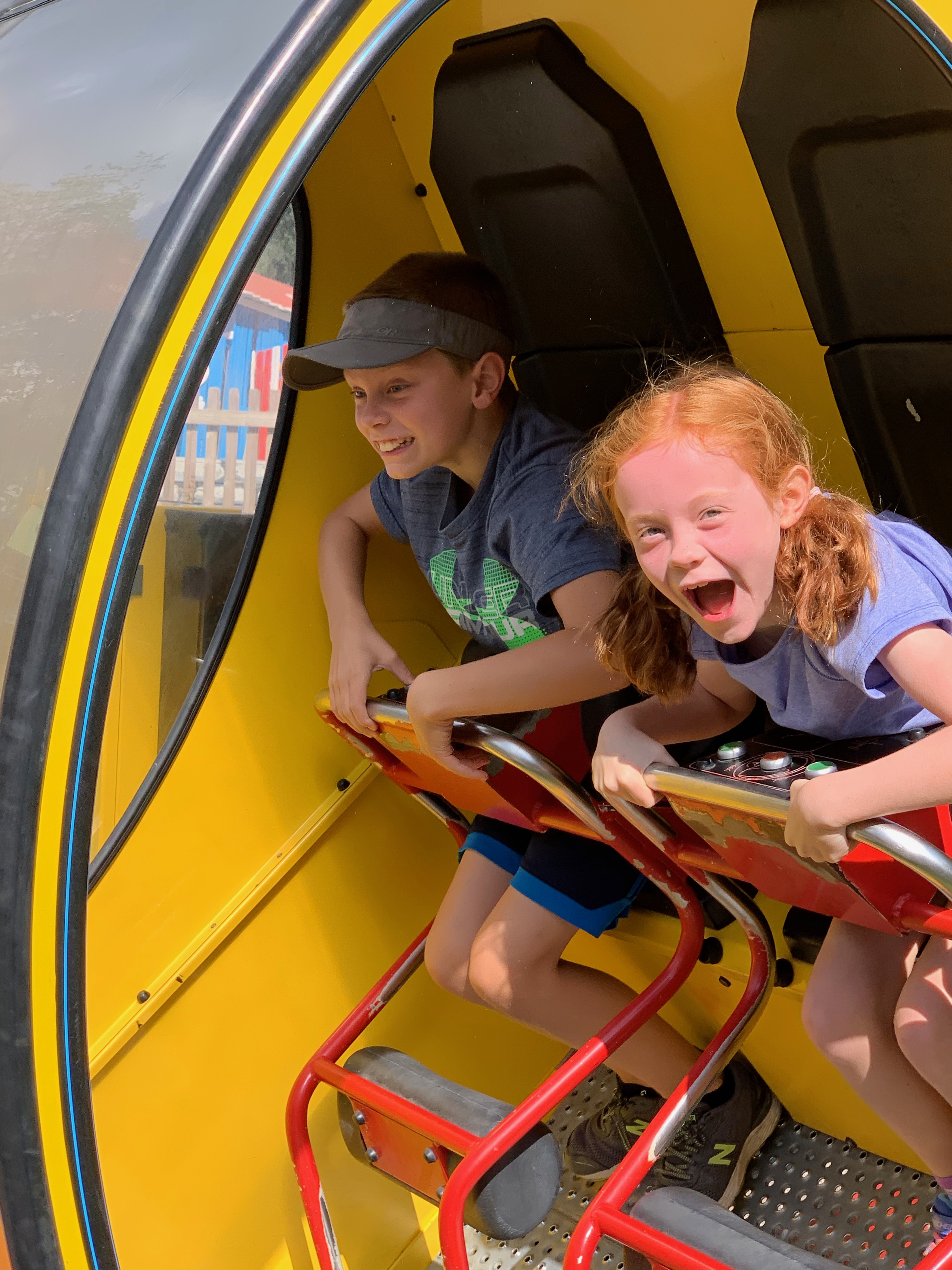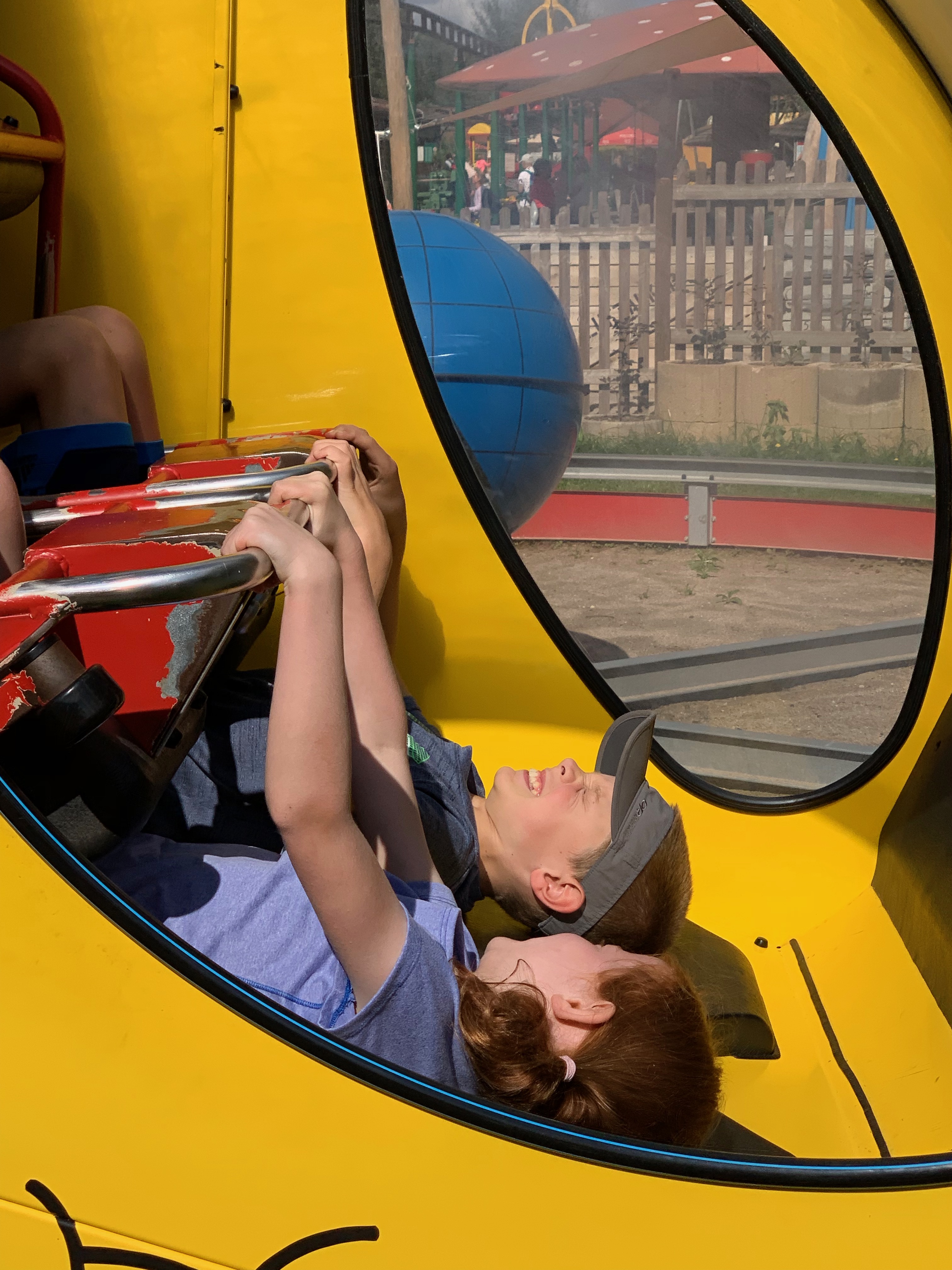 Or this one, where Cara and I put ourselves on a yellow banana coaster, locked our own bars, while Rowan closed the door to the ride and pressed a button to make us go.