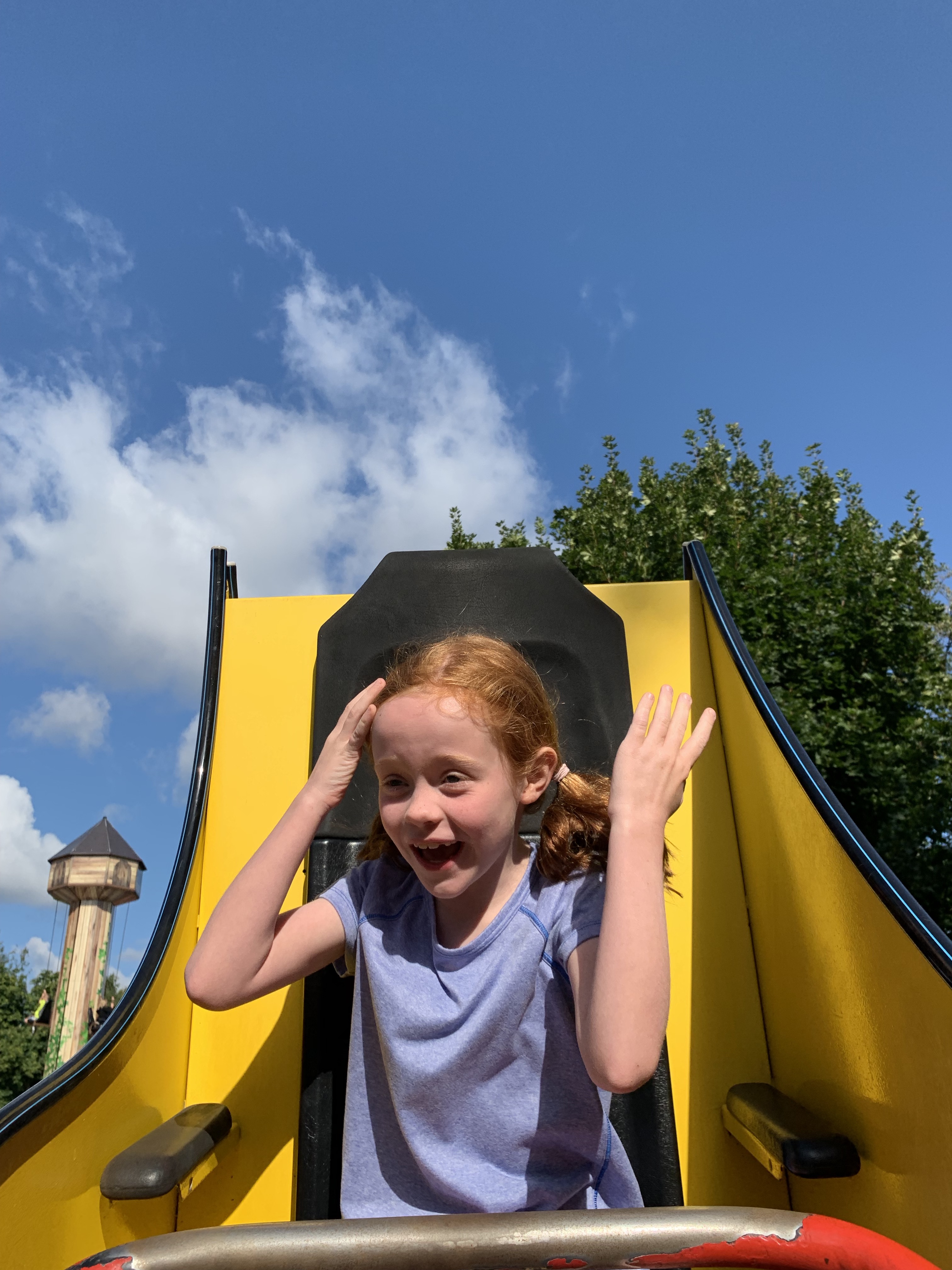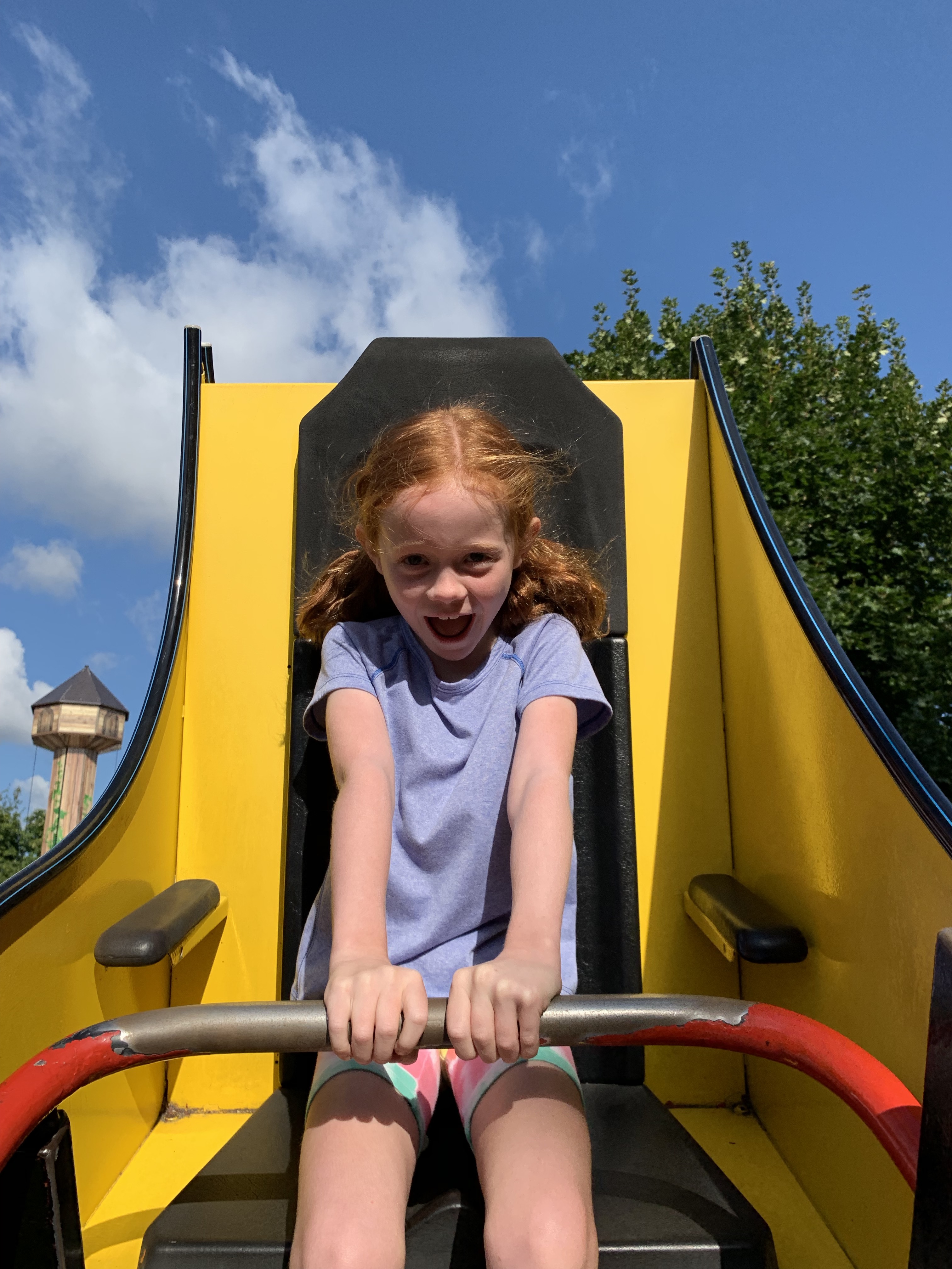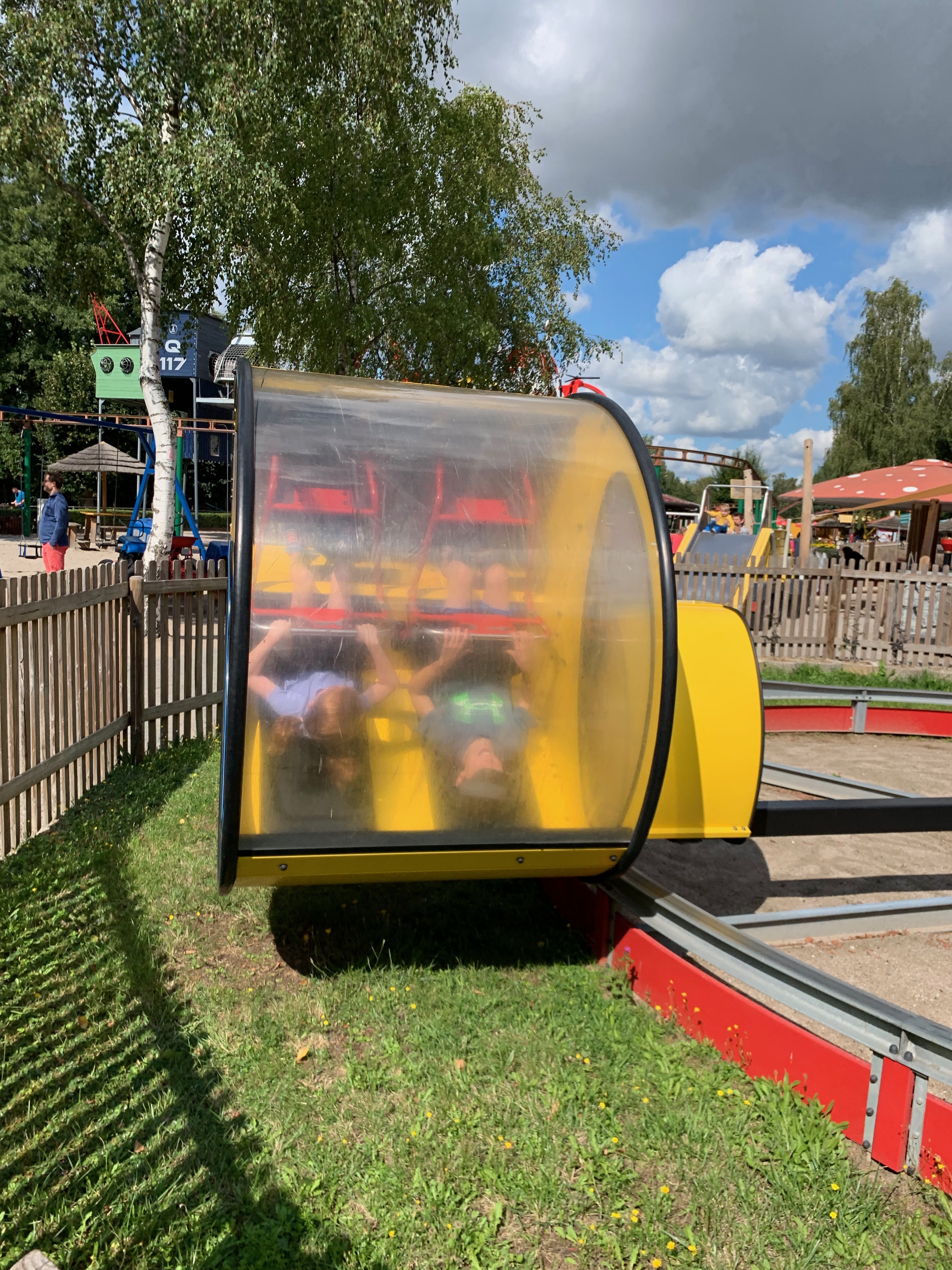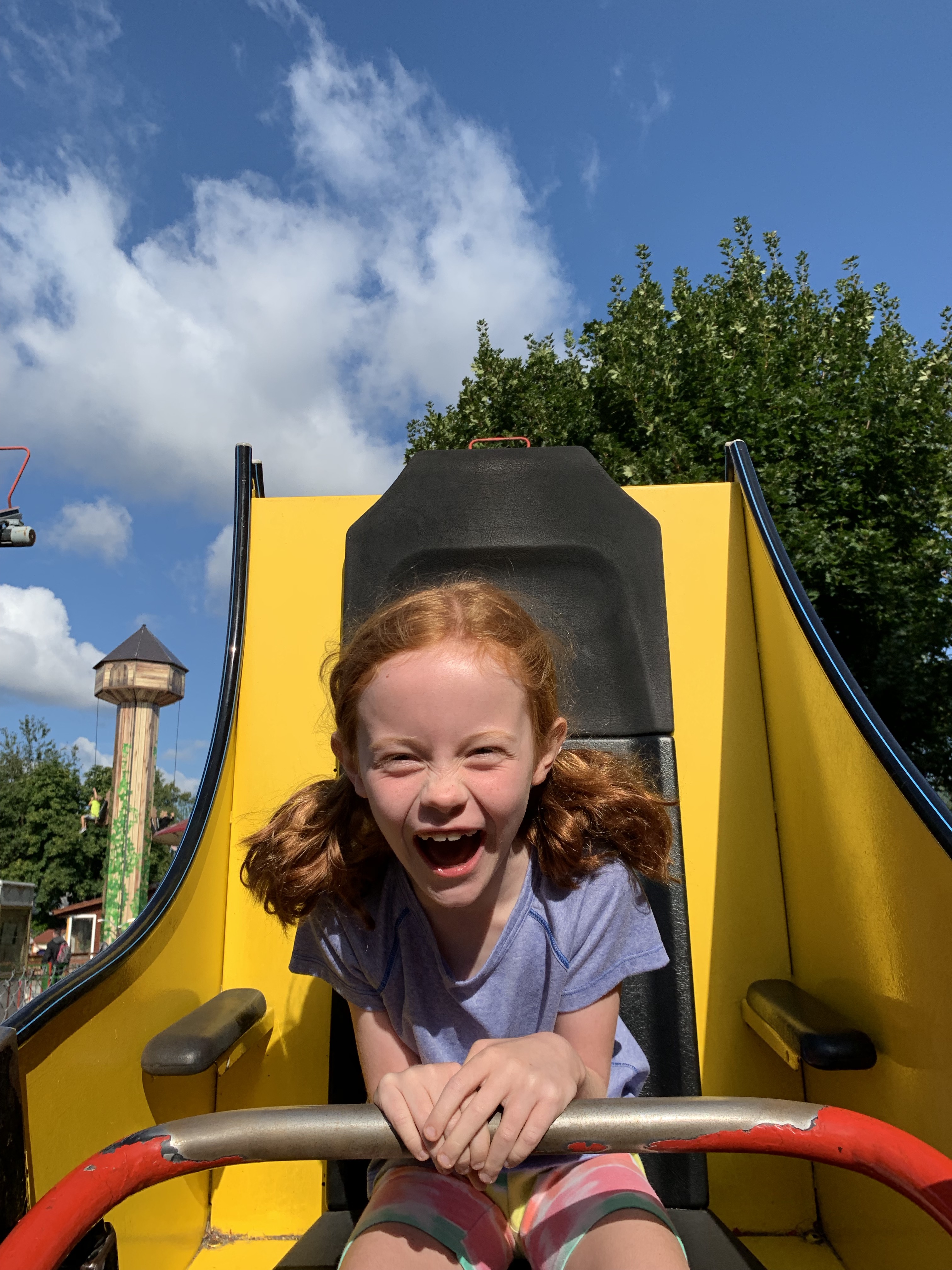Or this one, where Cara and I put ourselves on a yellow banana coaster, locked our own bars, while Rowan closed the door to the ride and pressed a button to make us go.