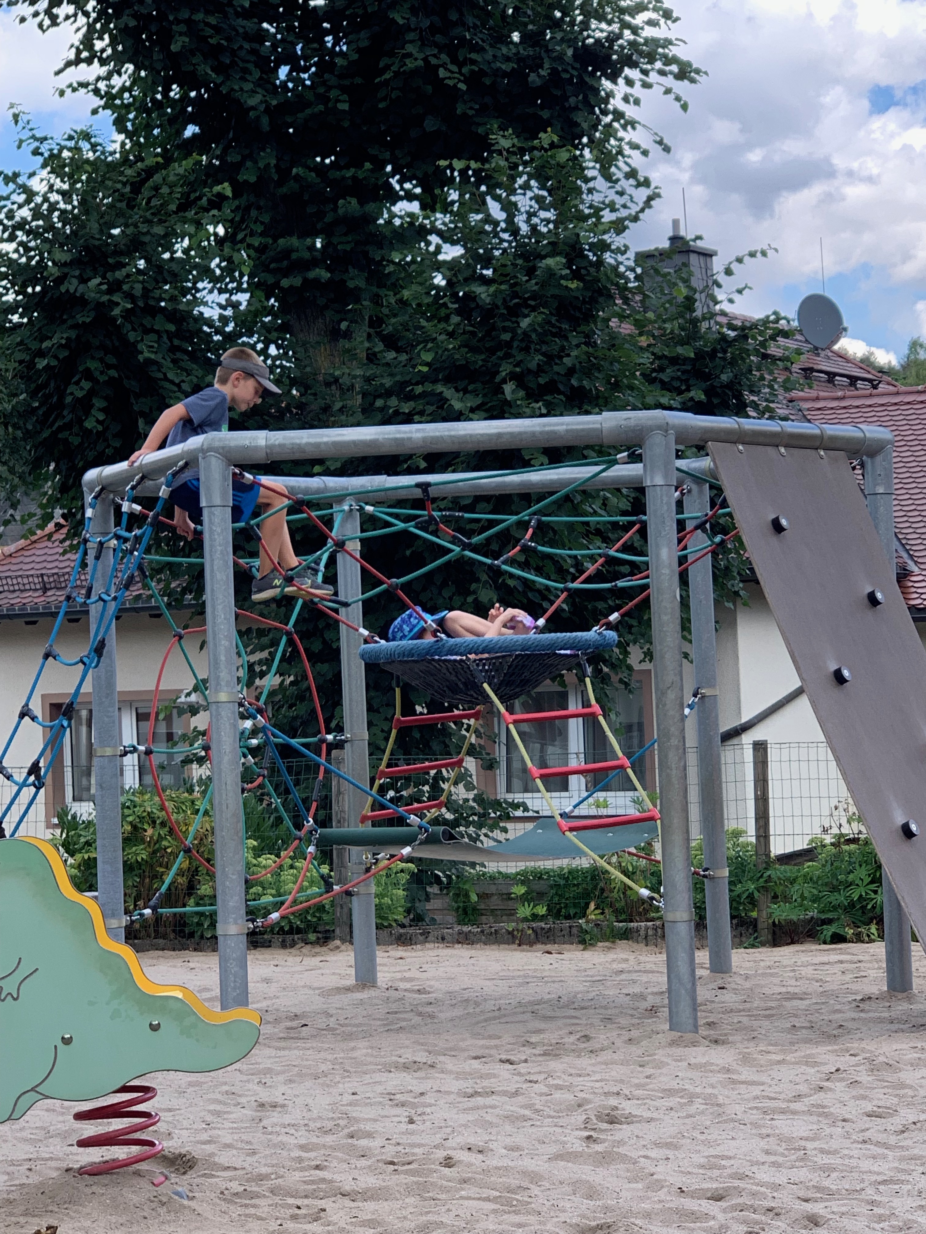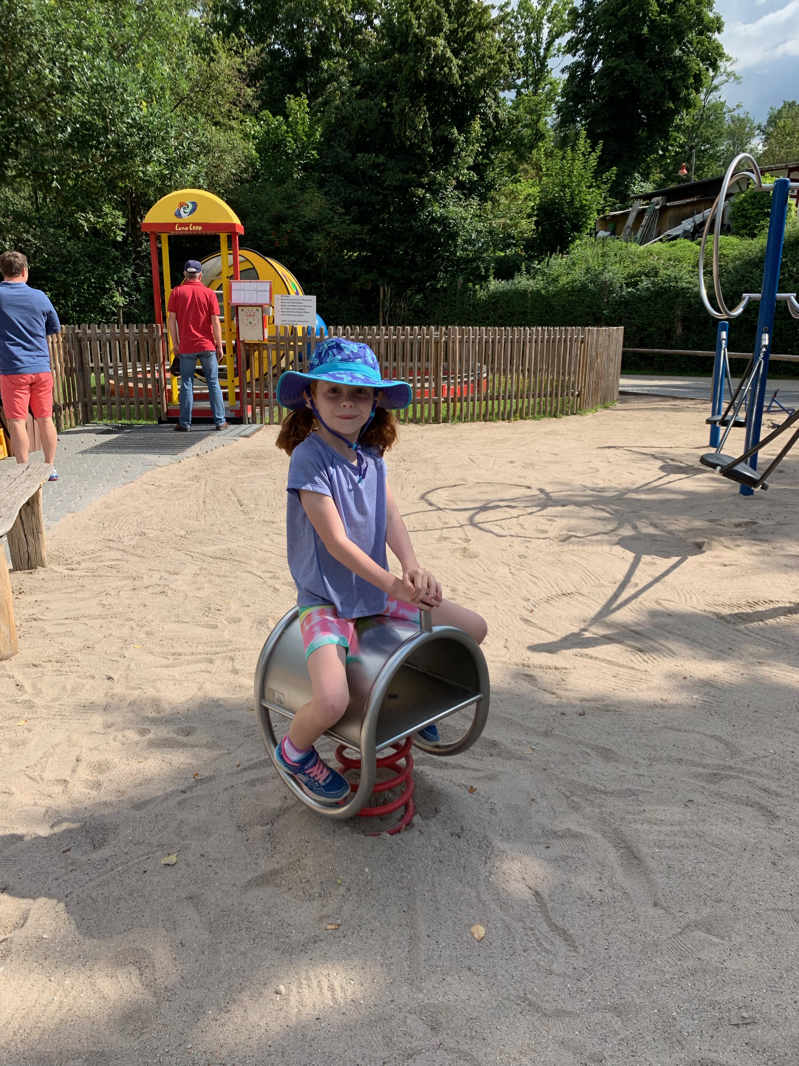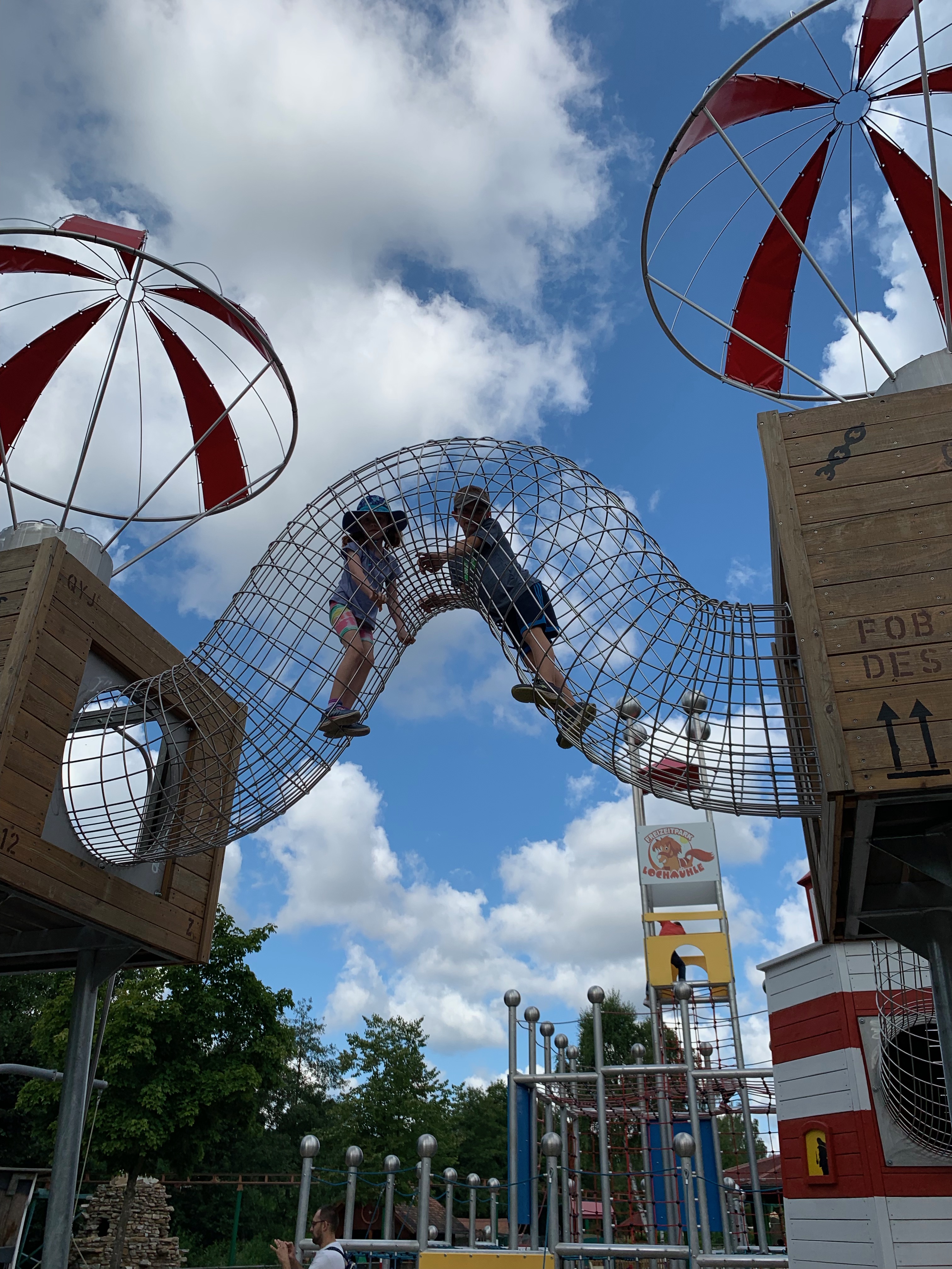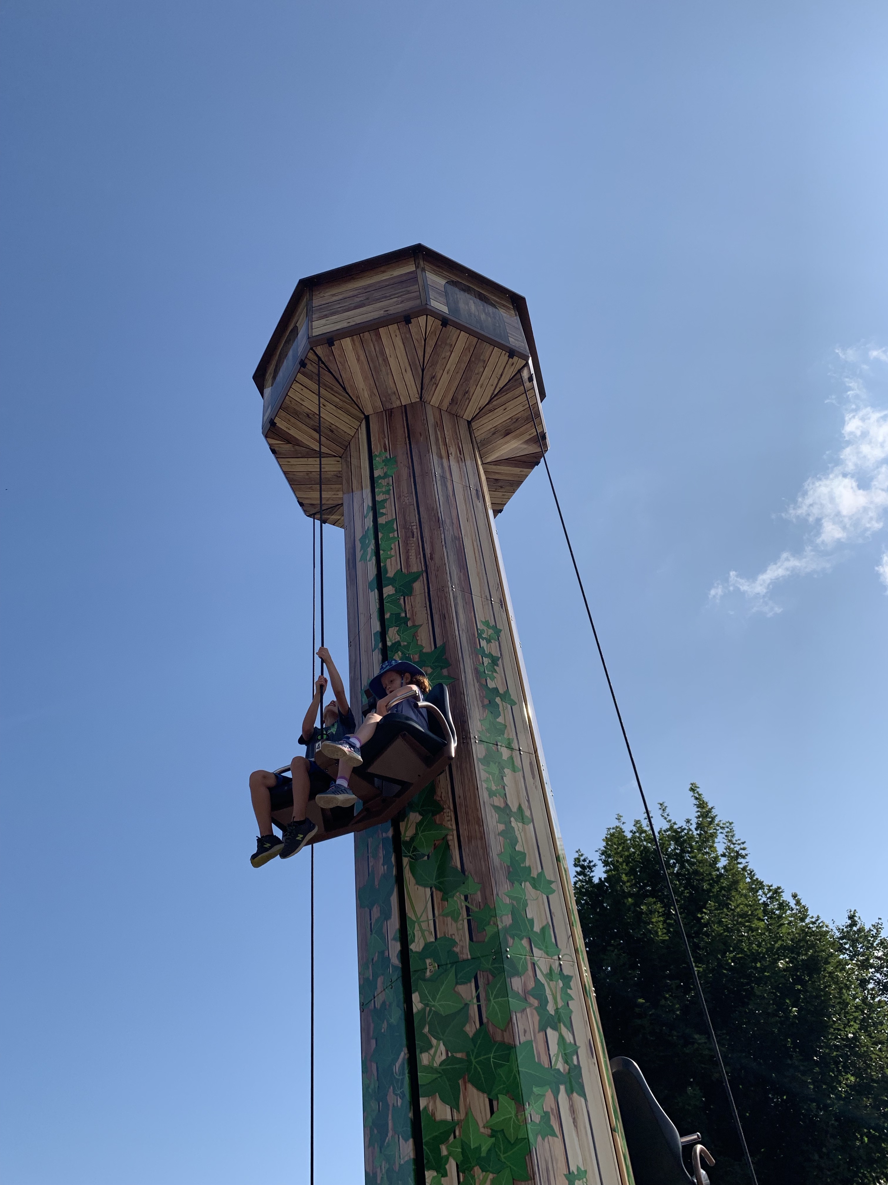 Before school started, the kids and I went to the local German amusement park, farm, and petting zoo – because why wouldn’t you put all those things together? The rides were soooo much smaller than anything you’d find in the US – no Incredible Hulk, Beast, or Space Mountain kinds of things here – BUT there is no liability here, which means no one can be sued for accidents, which really adds to the fun and excitement of the rides! For instance, the drop tower, where you can see Rowan hauling himself and Cara up to the top (this was after they’d buckled themselves in, but before they pressed the button at the top to drop themselves):
