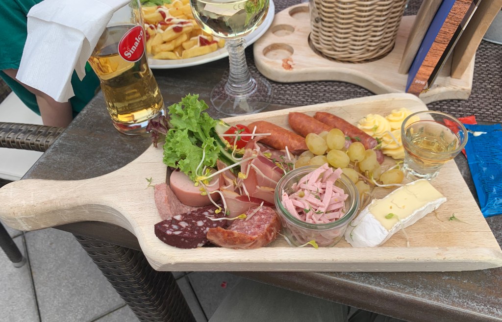 Our shovelboard of German meets, cheeses, fruit, butter – complete with a chaser!