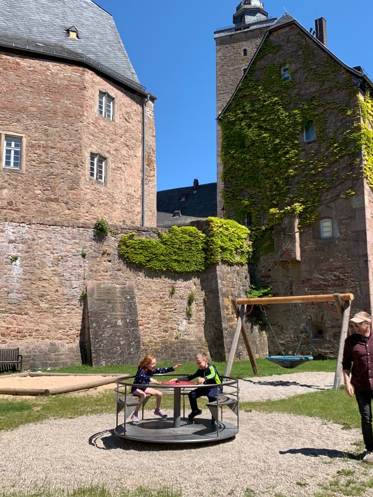 Next we checked out the Steinau castle – it was actually really big (and free!), and we enjoyed exploring the grounds. Our kids never get tired of running amok on castle walls and rocks, making up stories and playing out scenes, and this palace was no exception. As a bonus, there was an awesome playground located in the moat, where even Matt couldn’t resist the merry-go-round!