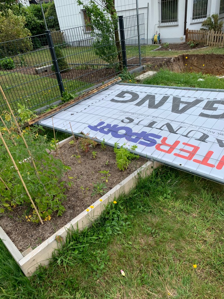 Next, the house borders our yard directly with little space between – we had planted a sunflower border along the back fence, had a hammock set up next to their garage, and a full ‘victory garden’ finally starting to produce all kinds of veggies and herbs. Not to mention our amazing new ‘storable (puncture-able) pool’ (yes, it’s an inflatable above-ground pool – never should have said never on that one).