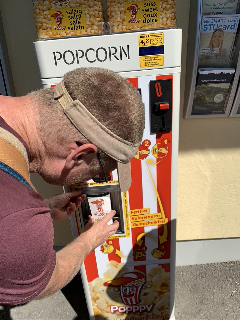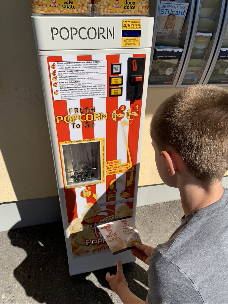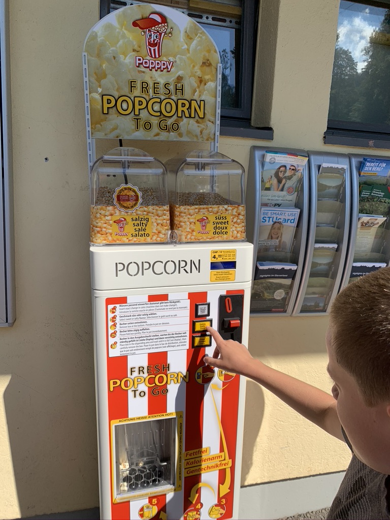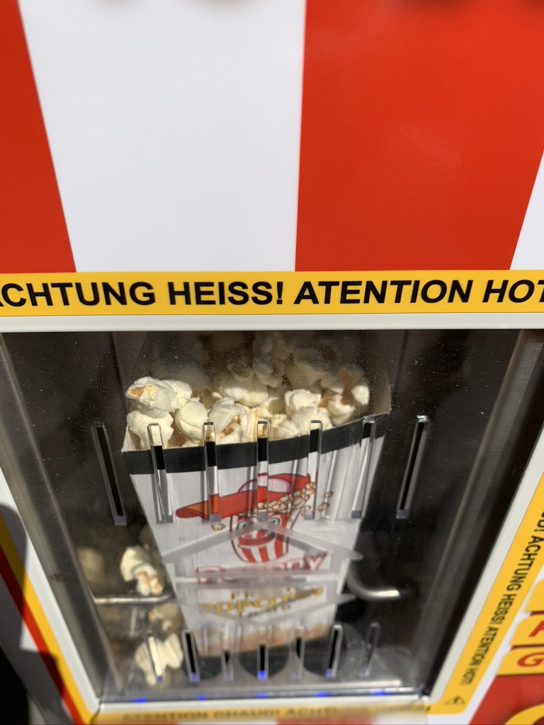 Coolest invention ever – fresh popcorn vending machine that pops while you wait. Delicious!