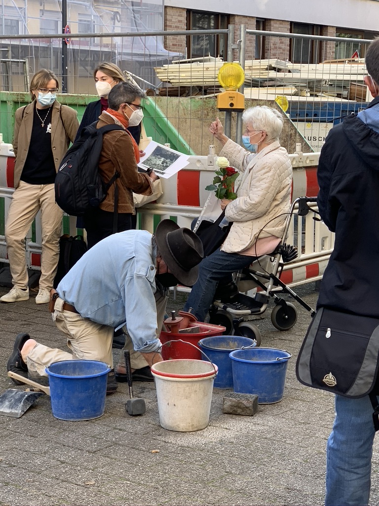 There was a small crowd to witness Mr. Demnig laying the stone, and lovely flute music to open and close the ceremony. The victim’s sister was there, along with a few other family members, and they had brought old brown-and-white family photos of the victim’s youth. One of them spoke some words about the victim – it was mostly in German, of course, so I only caught some of the story – apparently the victim was a girl who was sent to a mental institution because she was born with health issues, and euthanized there by the Nazi medical system during World War II.