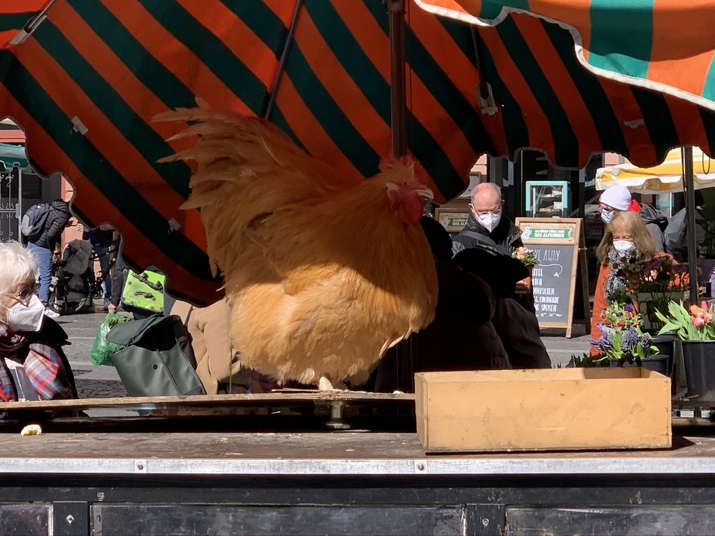 We also happened to be in town for market day, which is just the best as it means there’s a possibility for lunch. I ate my fried fish sandwich too quickly to take a picture, but I loved the ‘hot dog’ that Rowan got – it was 3 inches around and seemed ridiculous, until I spotted a sweet 70-something woman eating one just like it nearby. And also, this chicken was just strutting around on the counter of one of the vendors – no idea if it was a pet, an employee, or ‘on deck’?